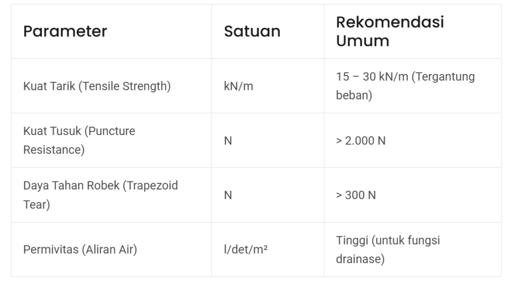 Untuk kondisi tanah lunak, parameter yang paling krusial bukan sekadar dimensi panjang/lebar roll, melainkan gramasi (berat per m²) dan kuat tarik (tensile strength). Berikut adalah panduan rekomendasi spesifikasinya:
