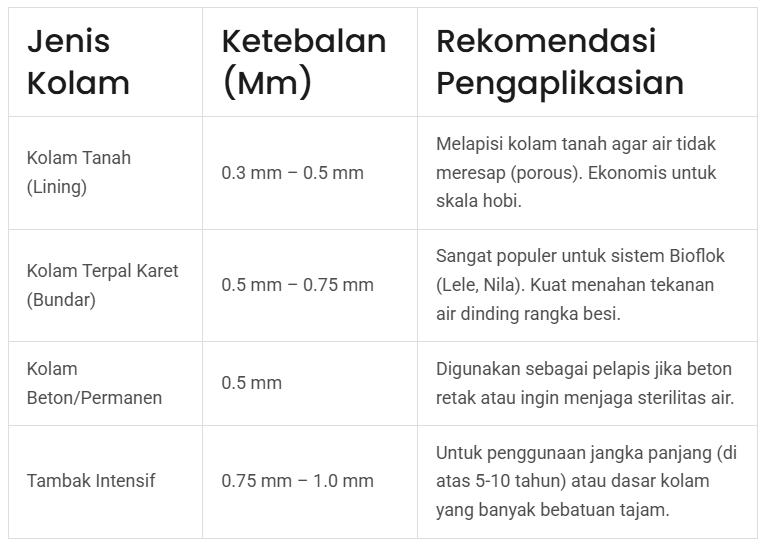 Berikut adalah panduan rekomendasi ukuran ketebalan geomembrane: